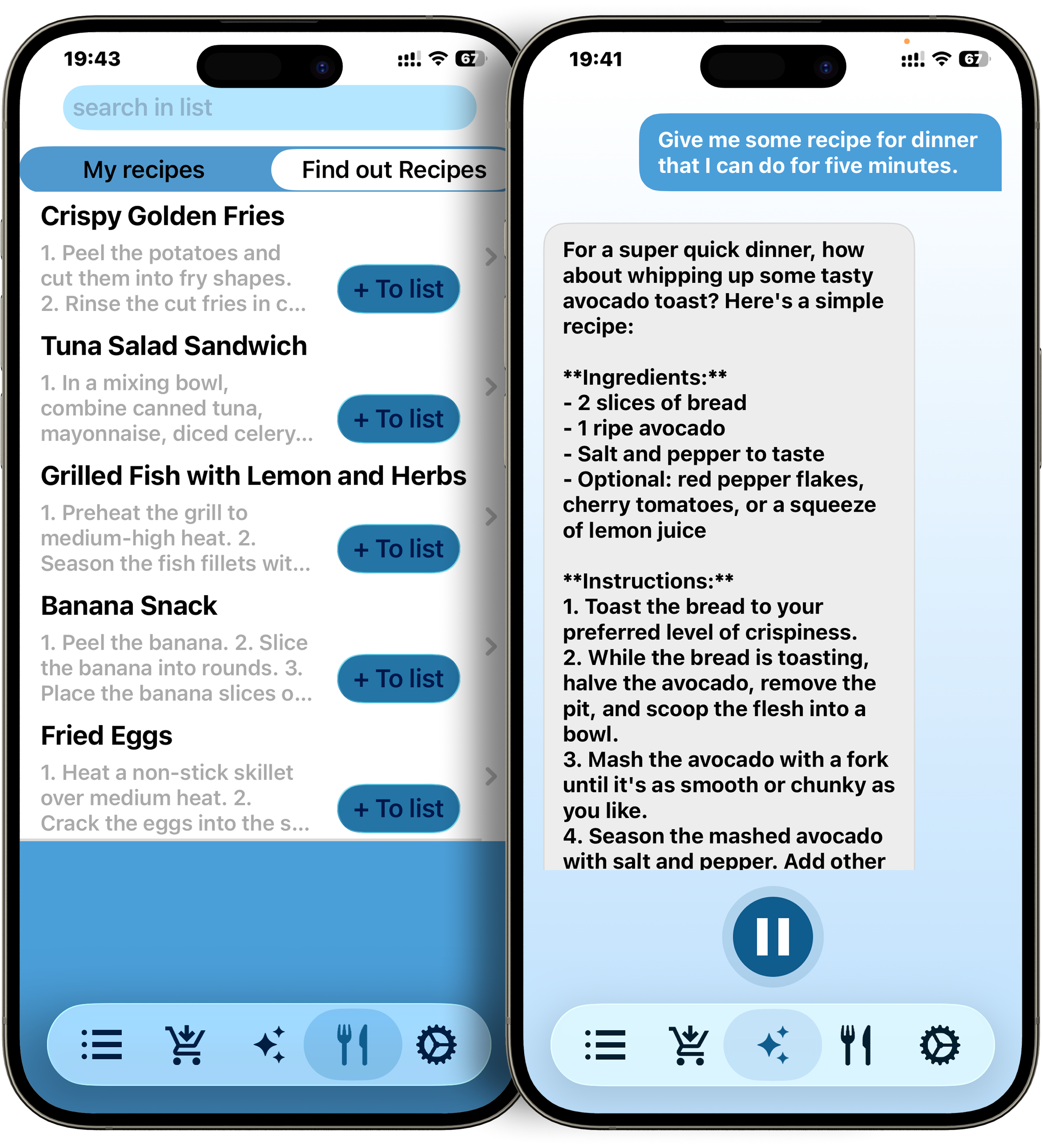 With its help you can ge your list from photo shot, from camera or form a shopping list from microphone. AI assistant can help you to get recipe to cook from a given list of ingredients or give an explanation about any of products. It's very easy to use it, just in live conversation with AI.