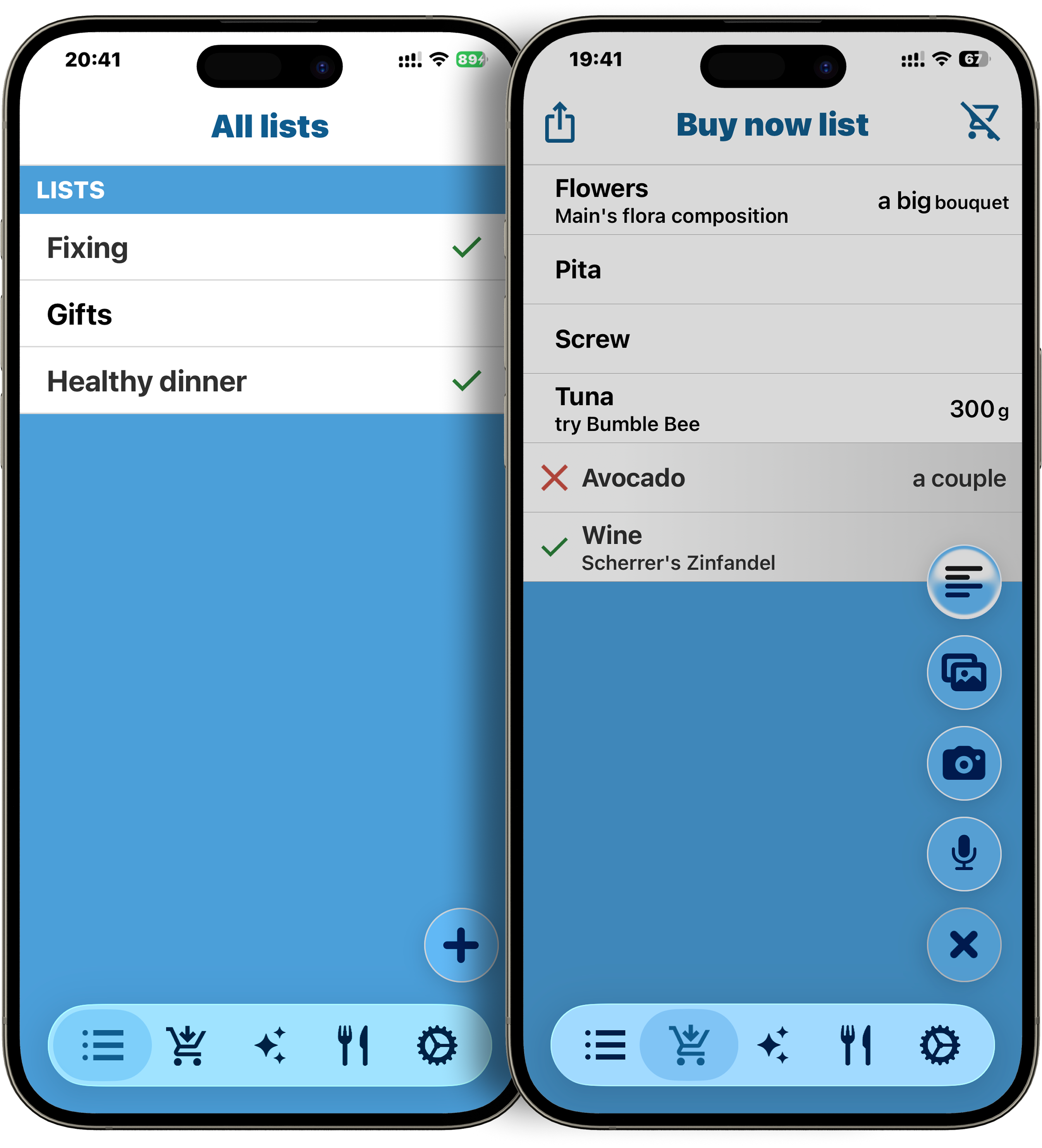 -Two-way marks. You can mark goods as bought(done) or absent(cancelled if you changed your mind), that gives more clear view to list